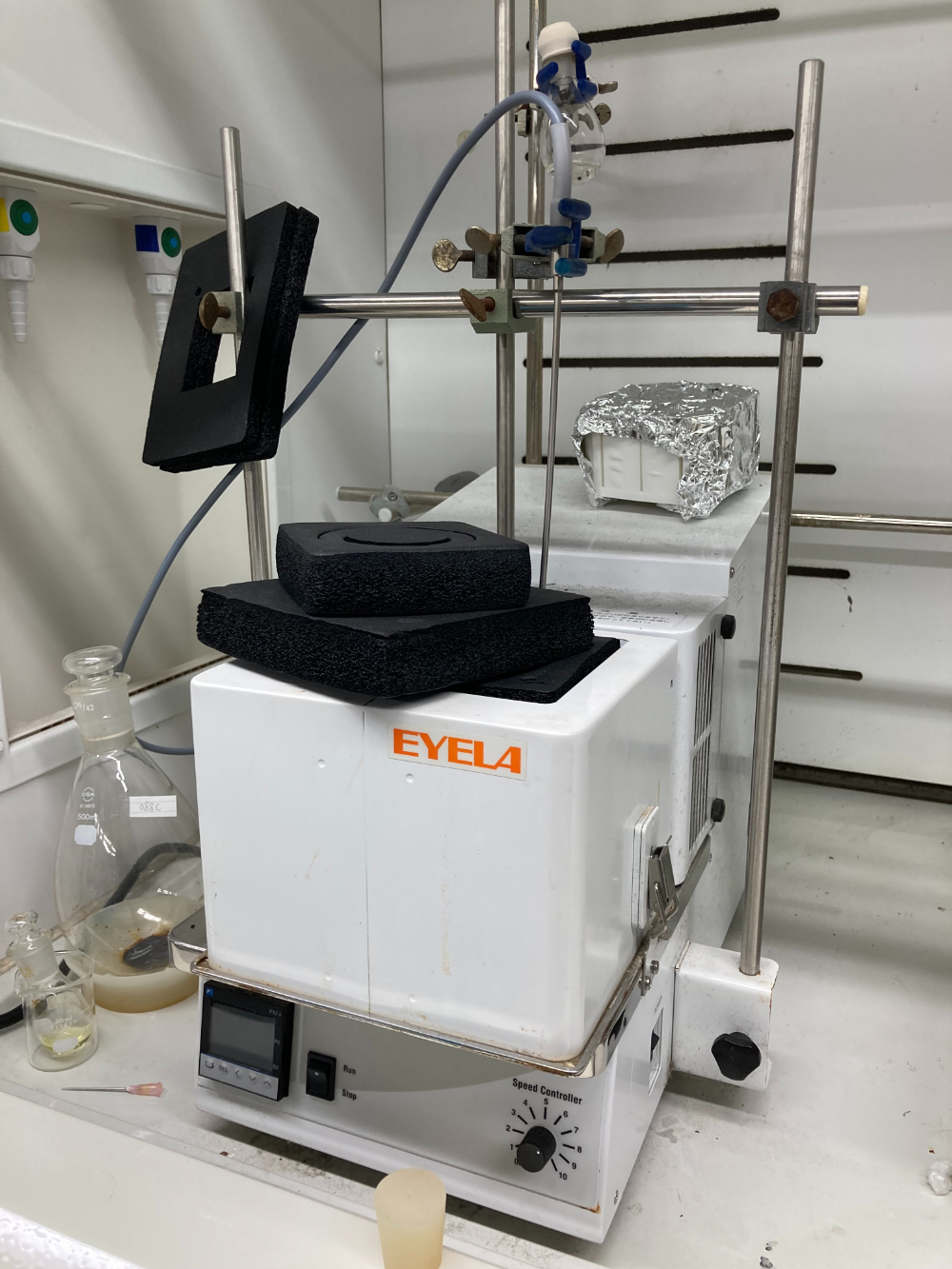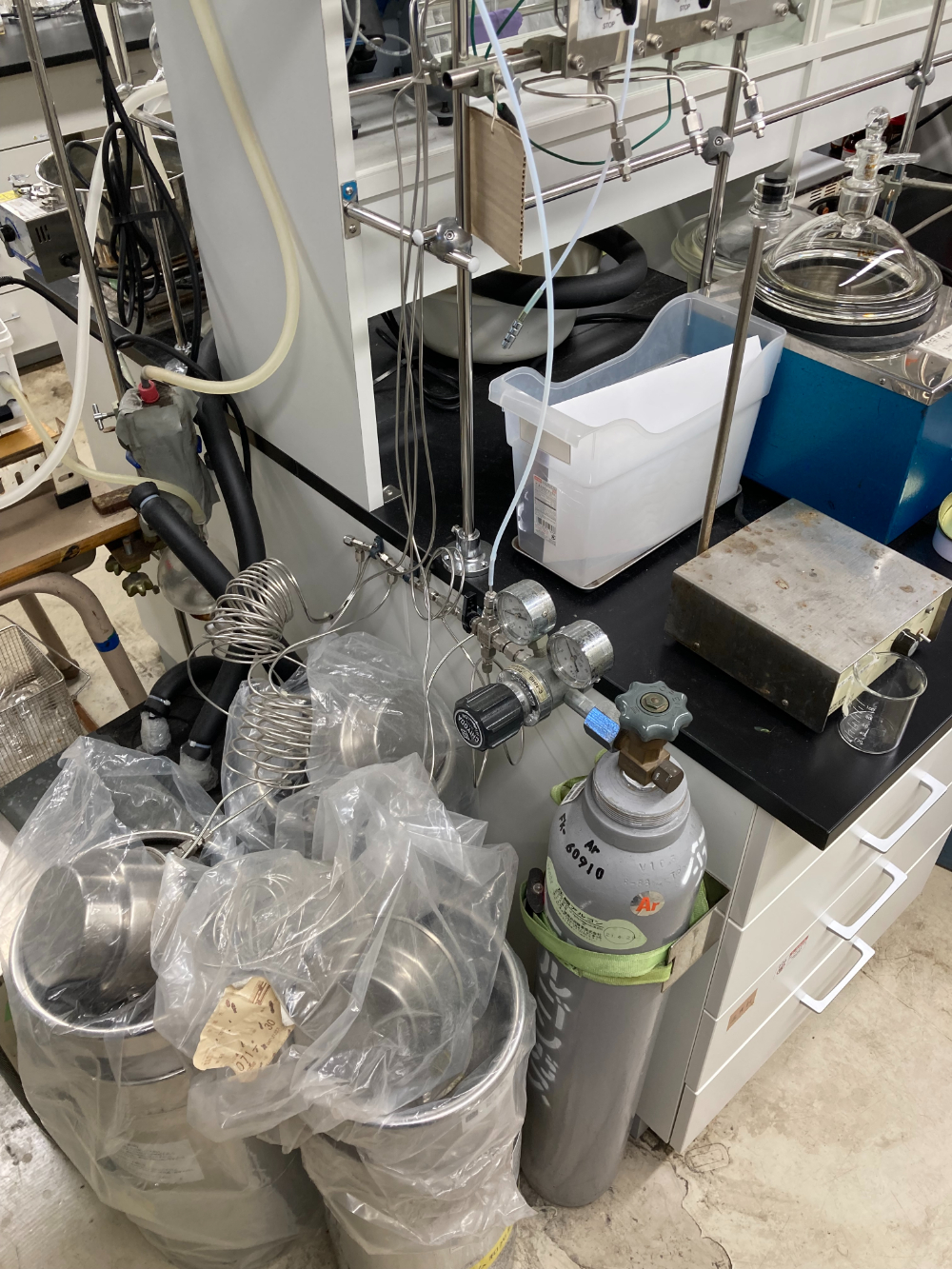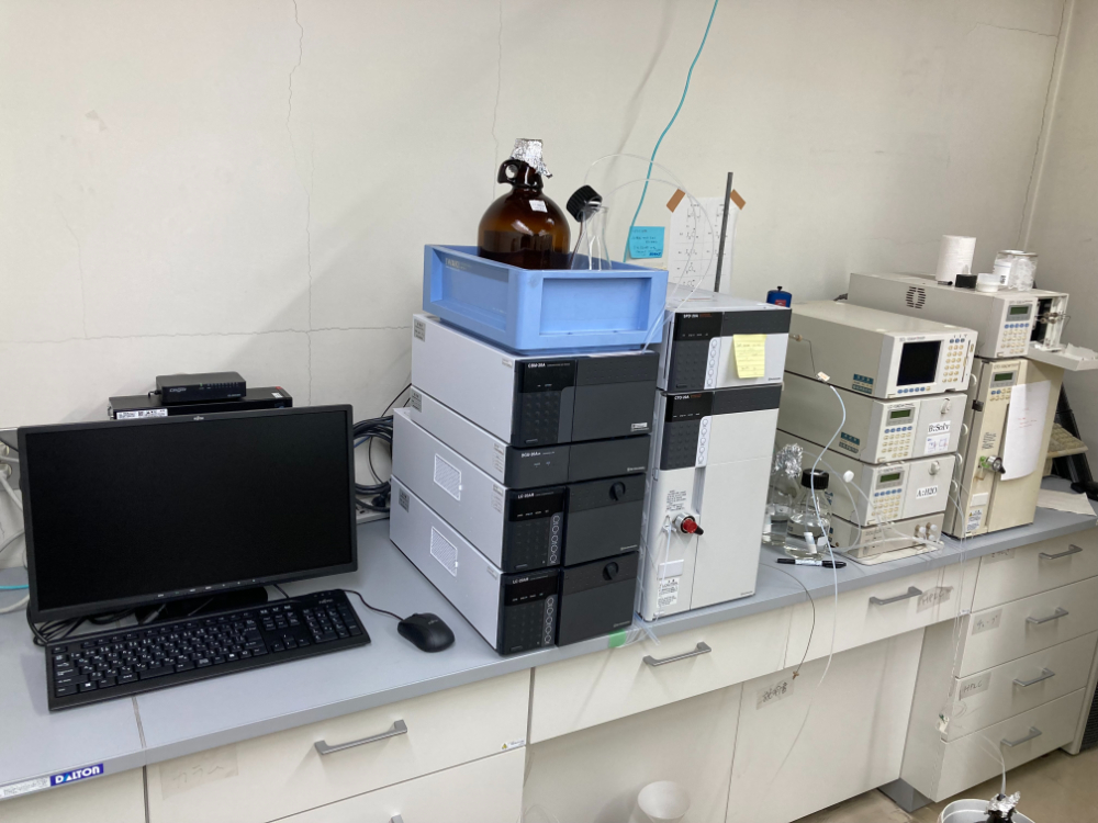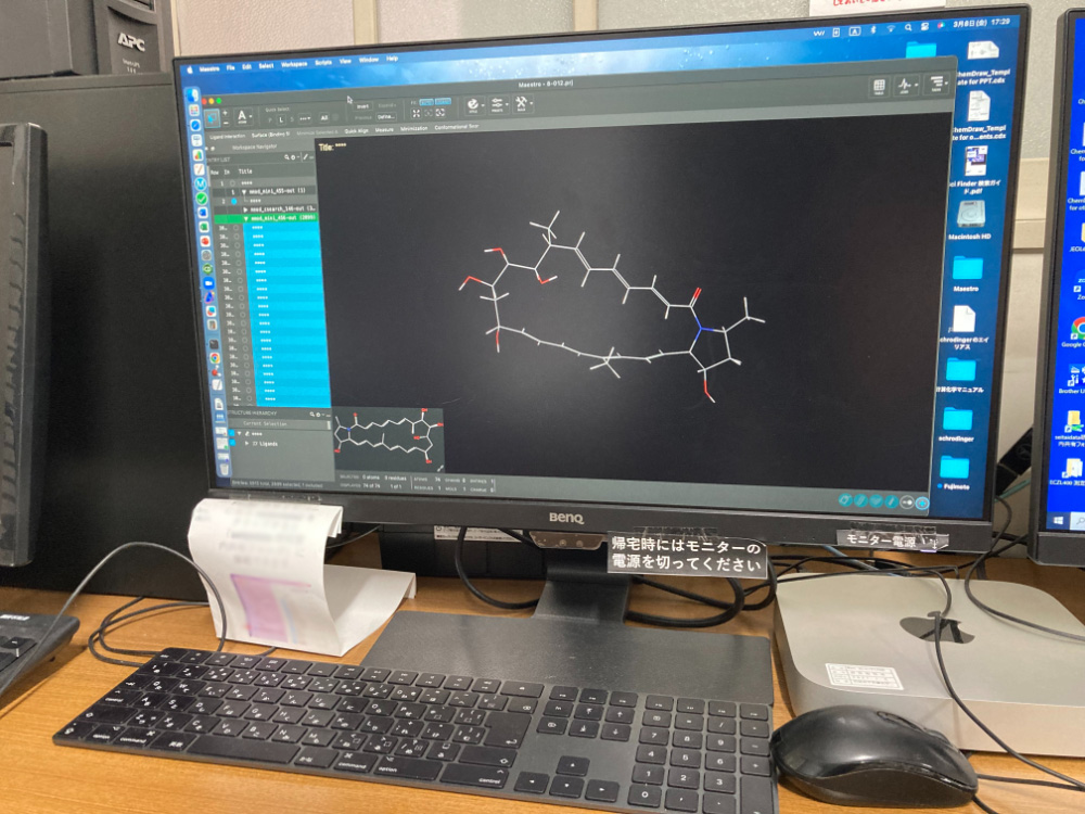 他にも、通常の有機合成反応や化合物の精製・機器解析を行うため、電子天秤、実験台、エバポレーター、ダイヤフラムポンプ、電子実験ノートシステム(Revvity Signals Notebook)などを整備し、利用しています。また、学内共用機器として、星薬科大学 機器センターに設置されている核磁気共鳴装置(600 MHz, 400 MHz)や質量分析計などを日常的に利用しています。
